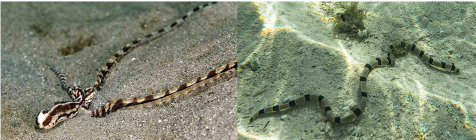 Primjer može biti i mimikrijska hobotnica koja nema oklop korišten od mnogih vrsta tijekom kambrijske eksplozije živih bića (od prije 541 do 485 milijuna godina), ali je zato razvila inteligentno rješenje zaštite i prikradanja plijenu. Prerušava se u oko šesnaest raznih morskih bića. Tako može glumiti otrovnu morsku zmiju, perastu zvijezde, sipu, ražu, trpa itd. kako već pojedina situacija zahtjeva.